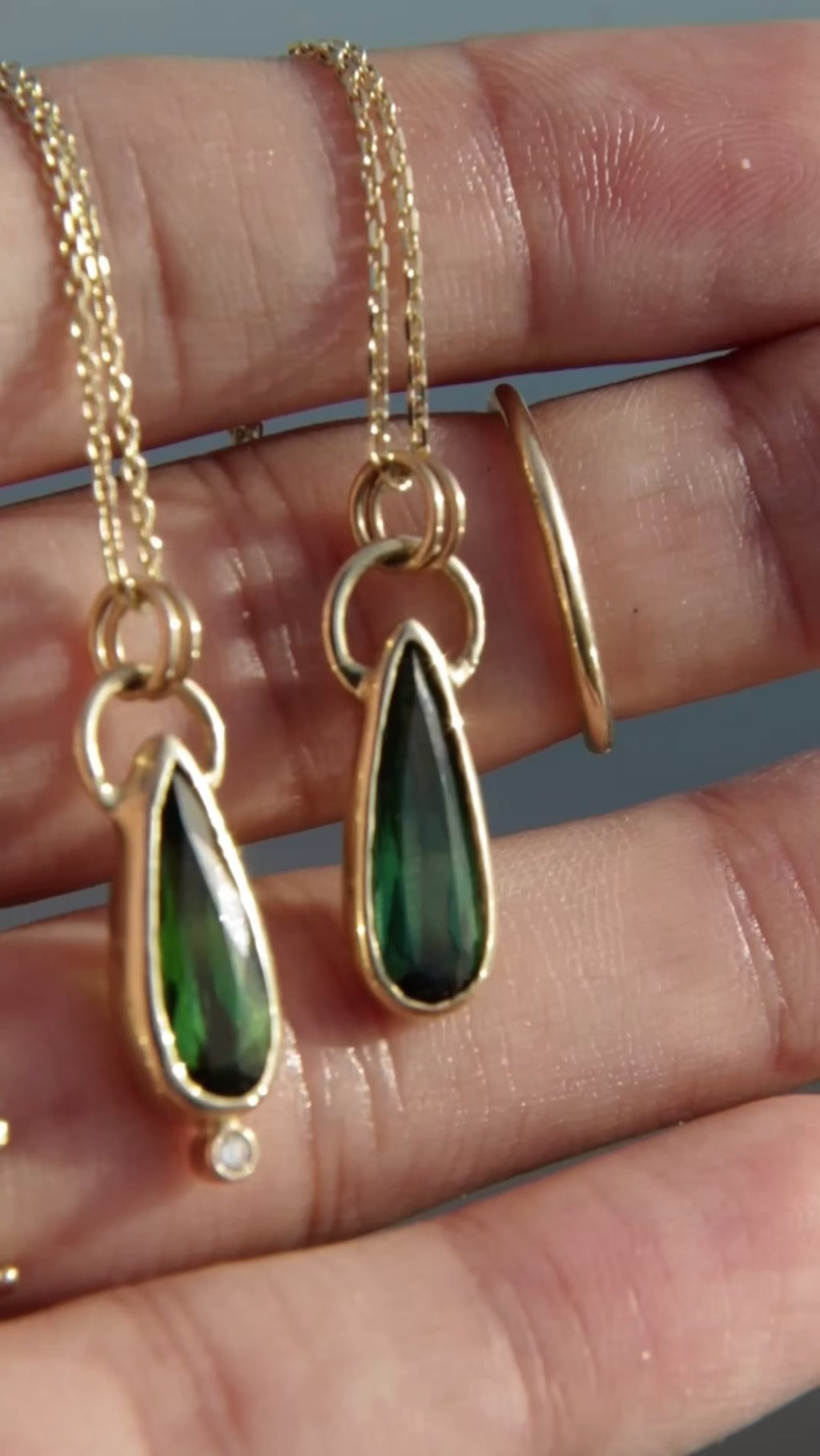 Handmade 14k yellow gold green tourmaline pendant, designed to be treasured as a modern heirloom.