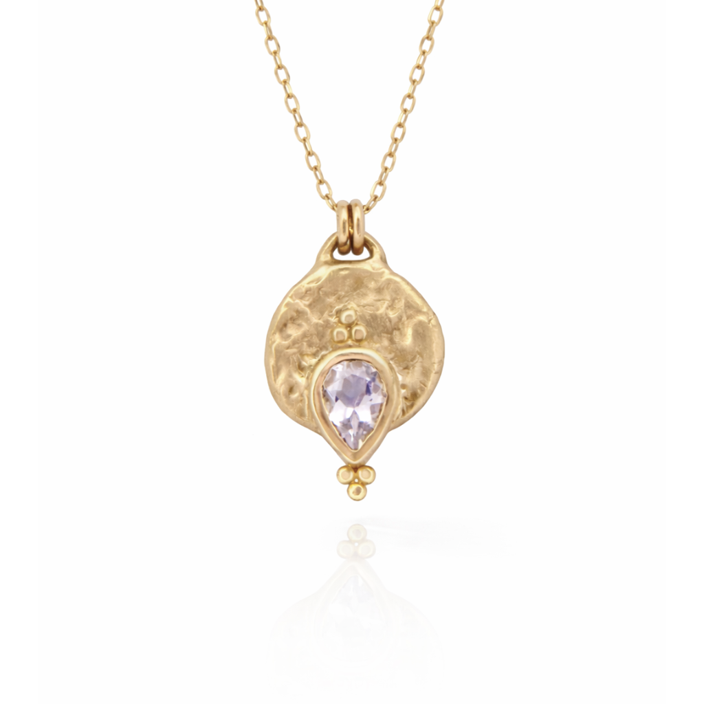 Moonstone in hammered gold, a pendant that honors Selene — goddess of the moon and bringer of night’s light.
